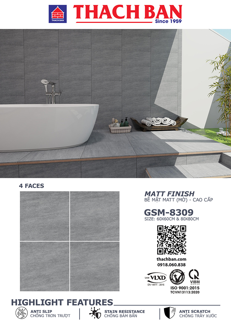 Gạch GranyLite Thạch Bàn GSM 8309 Bề Mặt Matt Mờ Nhà sản xuất Gạch Thạch Bàn, Kích thước: 80×80, 60X60, 30x60cm Loại Gạch GranyLite cao cấp.
