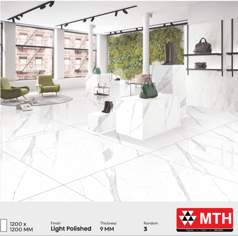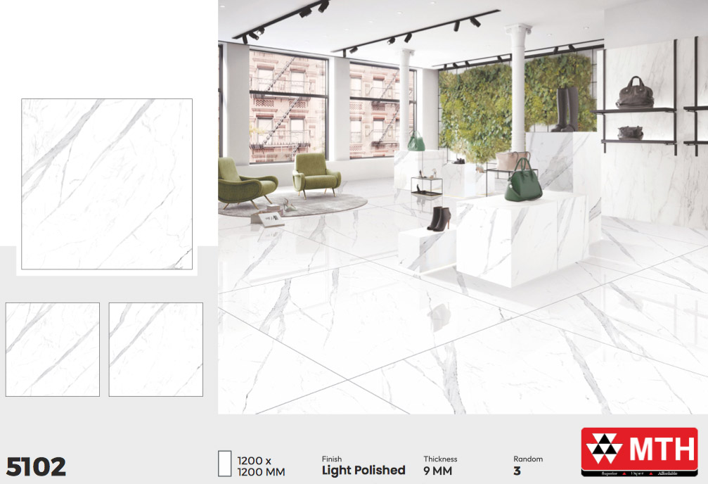 Gạch MTH India (Ấn Độ) 5102 (1200x1200mm) hiệu ứng Light polished Có Bề mặt Bóng kính vân đá tự nhiên. 1 thùng đóng 2 viên = 2m², dầy 9mm, random 3 face…