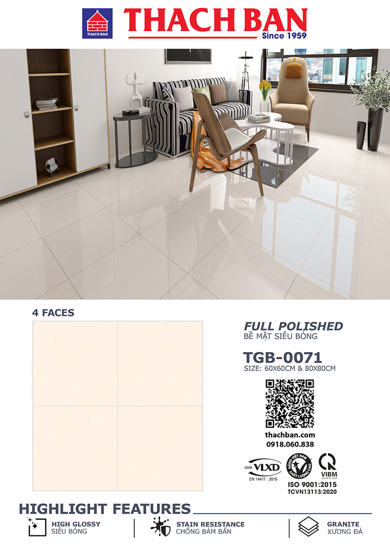 Gạch Tbgres Thạch Bàn TGB-0071 Bề Mặt Bóng kính tông vàng, sản xuất Gạch Thạch Bàn, Kích thước: 80×80,60X60cm Loại Gạch Granite siêu bóng, chống bám bẩn.