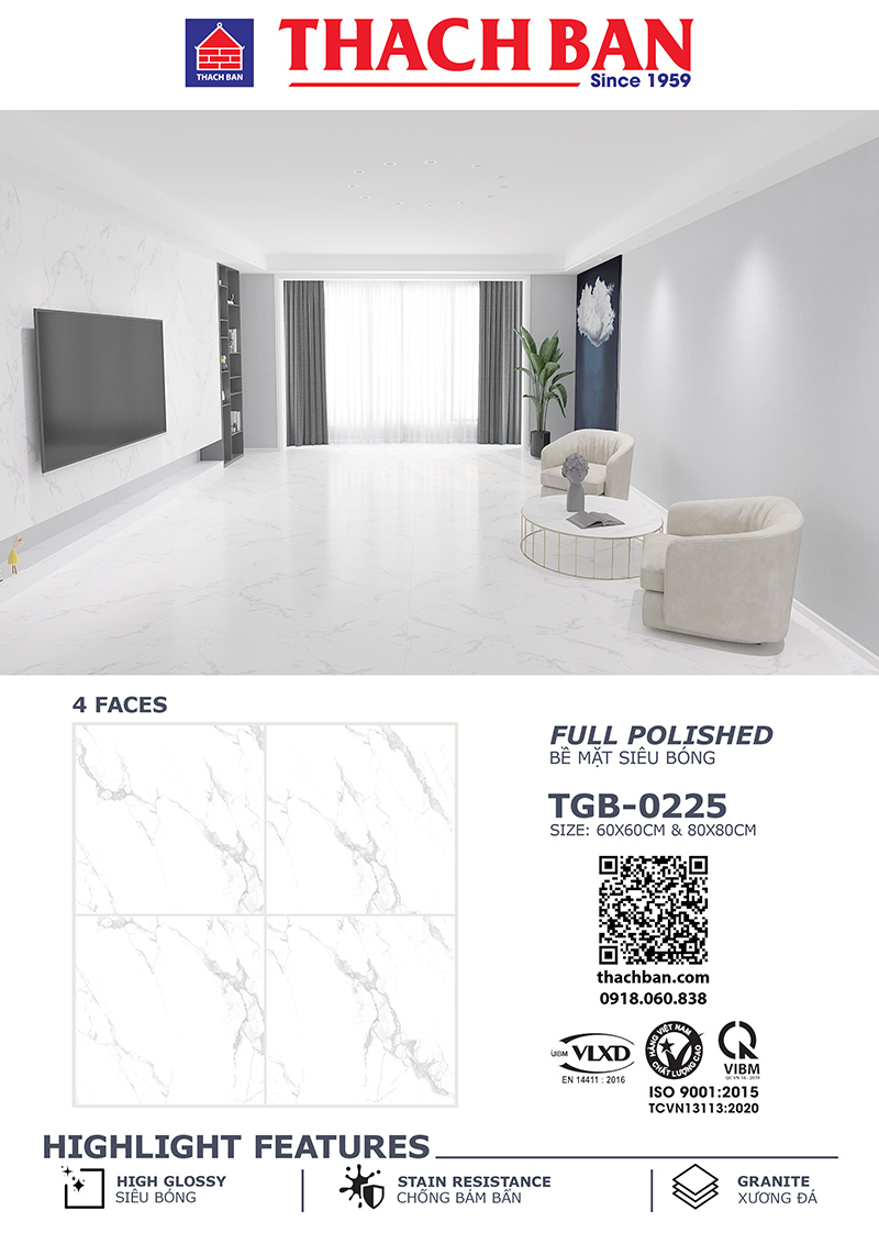 Gạch Tbgres Thạch Bàn TGB-0225 Bề Mặt Bóng kính tông trắng khói, sản xuất Gạch Thạch Bàn, Kích thước: 80×80, 60X60, 30x60cm Gạch Granite siêu bóng.