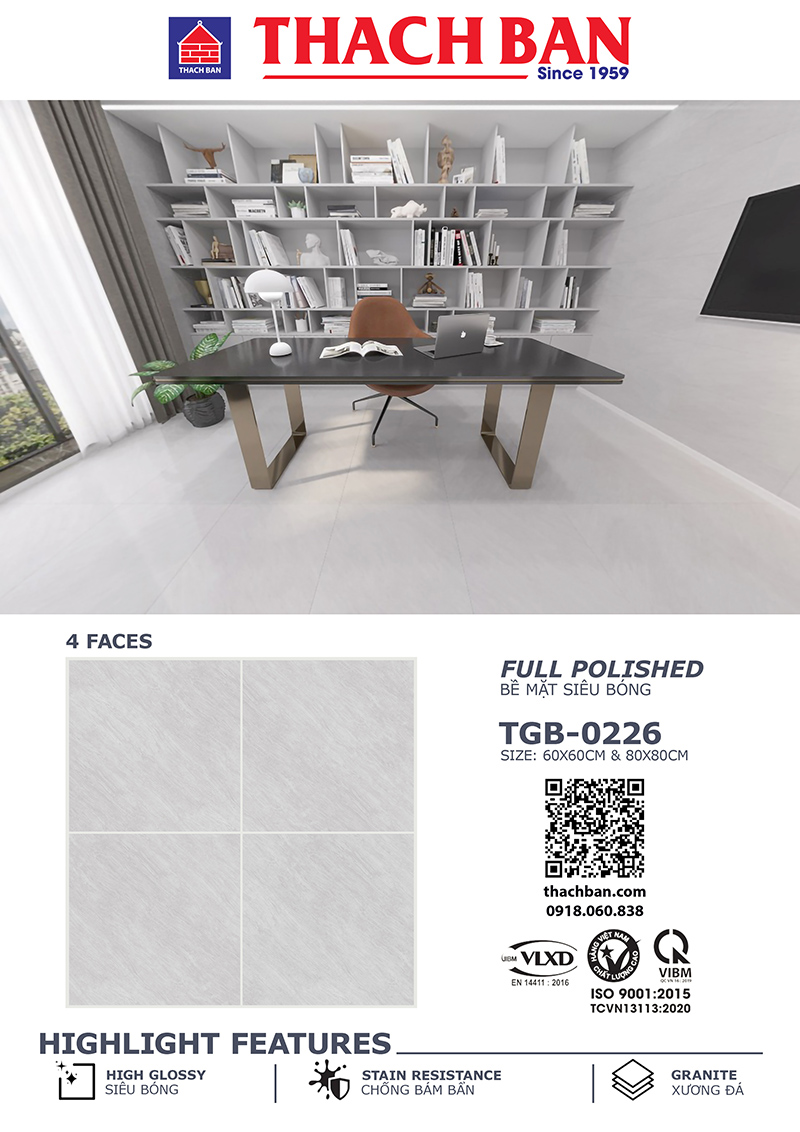 Gạch Tbgres Thạch Bàn TGB-0226 Bề Mặt Bóng kính tông đá xám nhẹ, sản xuất Gạch Thạch Bàn, Kích thước: 80×80, 60X60, 30x60cm Gạch Granite siêu bóng.