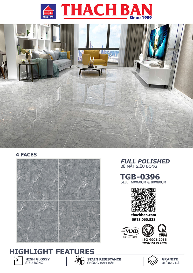 Gạch Tbgres Thạch Bàn TGB-0396 Bề Mặt Bóng kính vân đá tông màu xám đậm, sản xuất Gạch Thạch Bàn, Kích thước: 80×80, 60X60cm Gạch Granite siêu bóng.