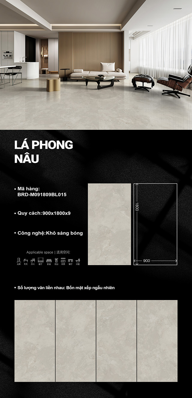 Lá Phong Nâu BRD-M091809BL015 kích thước 900x1800x9mm bề mặt bóng. Thương hiệu đá nung kết Boride, 4 mặt vân xếp ngẫu nhiên. trên , dưới, trái, phải…