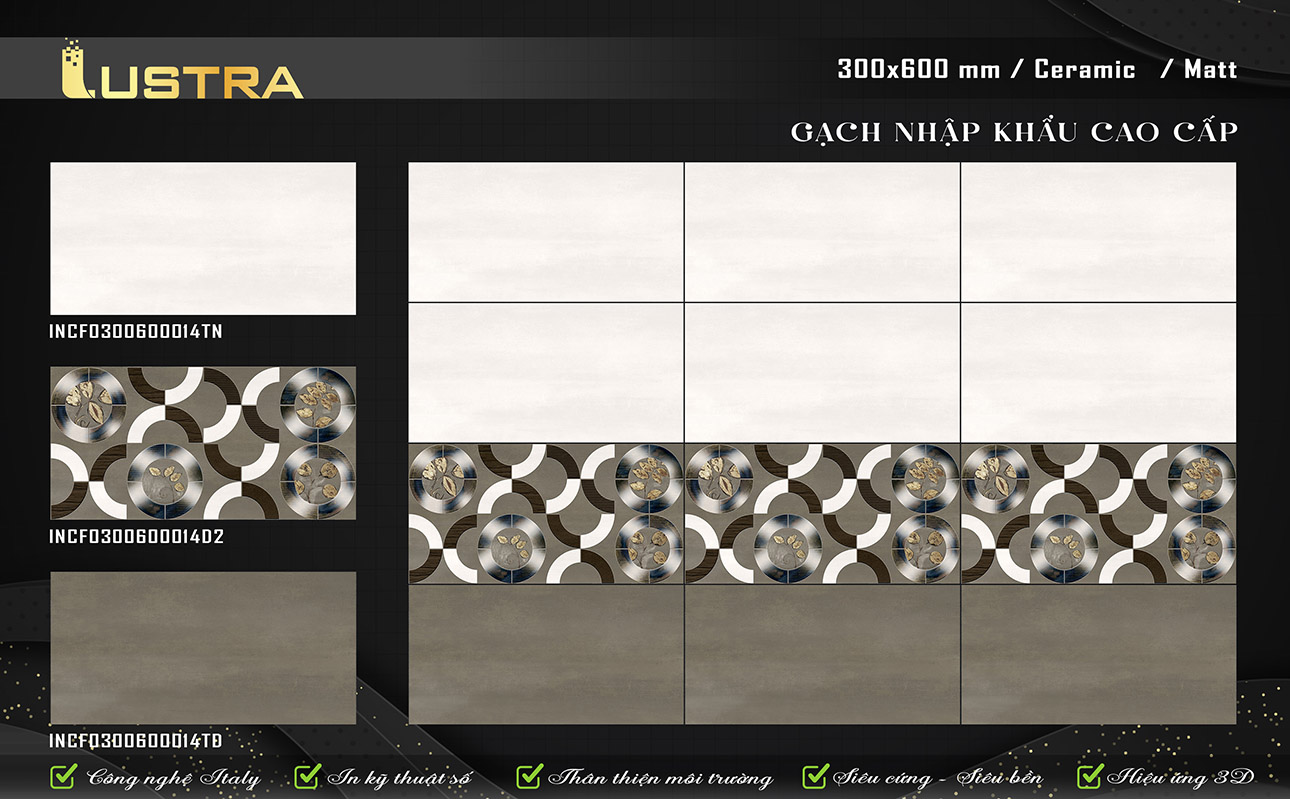 Gạch Lustra INCF0300600014D2 (300x600mm) Xương Ceramic Matt / Glossy, công nghệ italy in kỹ thuật số dùng ốp tường, siêu cứng và bên, hiệu ứng 3D…