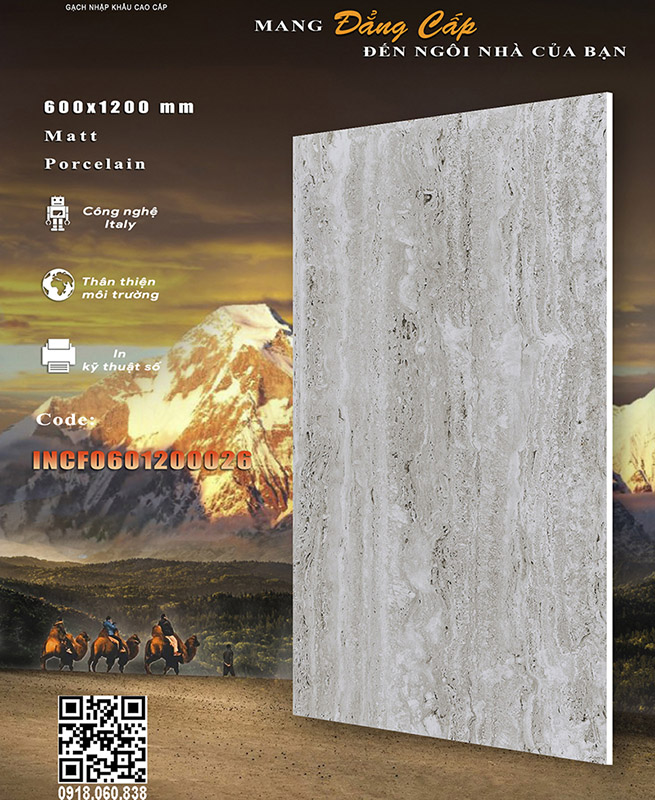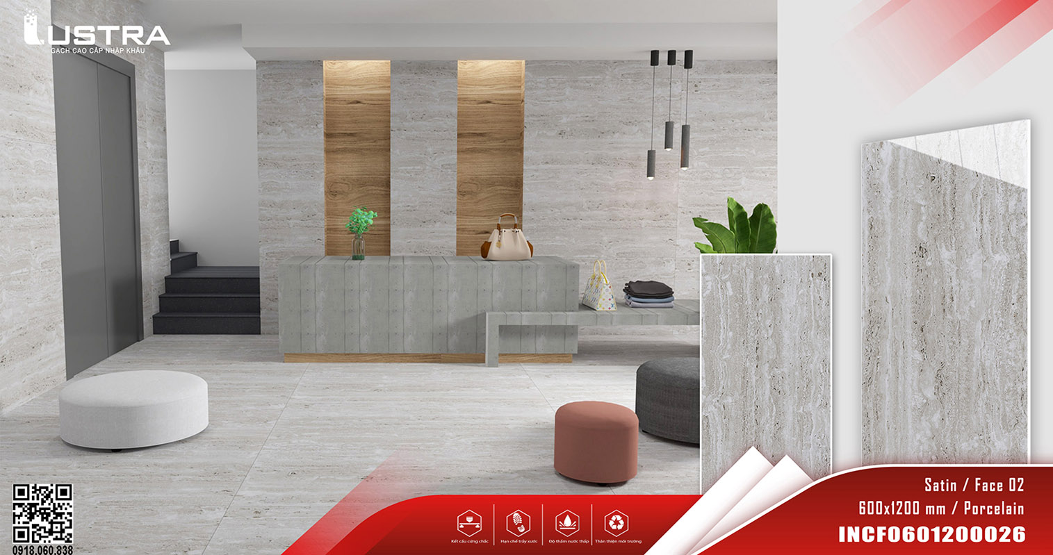 Gạch Lustra INCF0601200026 (60x120CM) mặt MATT vân ĐÁ, dùng Lát nền, ốp tường. Xương gạch Porcelain có độ hút nước rất thấp (nhỏ hơn 0.5%), dầy 9,4mm
