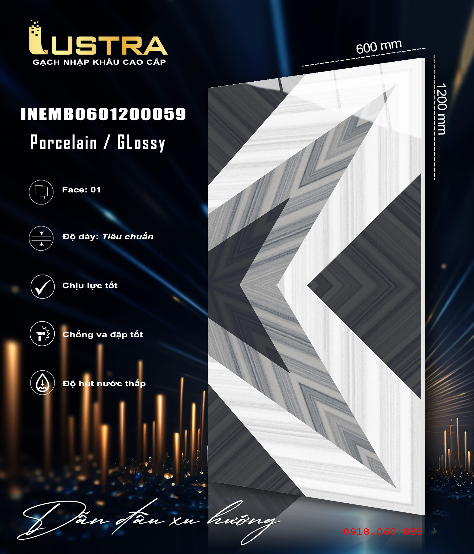 Gạch Lustra INEMB0601200059 (60x120CM) bề mặt bóng Kính vân 3D, dùng ốp tường trang trí. Xương gạch Porcelain có độ hút nước rất thấp (nhỏ hơn 0.5%)…