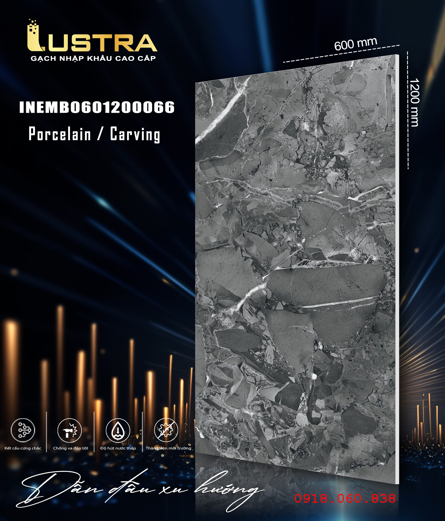 Gạch Lustra INEMB0601200066 (60x120CM) bề mặt bóng Kính vân đá, dùng Lát nền, ốp tường. Xương gạch Porcelain có độ hút nước rất thấp (nhỏ hơn 0.5%)…
