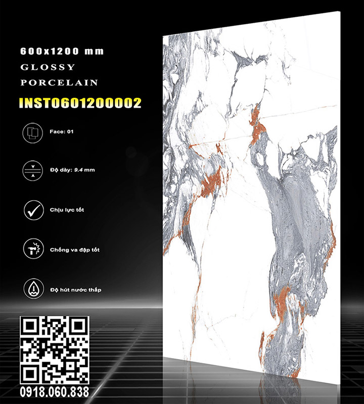 Gạch Lustra INST0601200002 (60x120CM) mặt Bóng Kính vân ĐÁ, dùng Lát nền, ốp tường. Xương gạch Porcelain có độ hút nước rất thấp (nhỏ hơn 0.5%), dầy 9,4mm